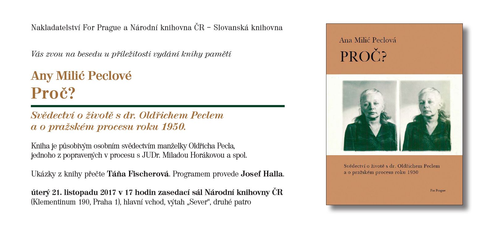 V úterý 21. listopadu bude ve spolupráci s Národní knihovnou v Zasedacím sále Klementina představena kniha pamětí Any Milić Peclové „Proč? Svědectví o životě s dr. Oldřichem Peclem a o pražském procesu roku 1950".